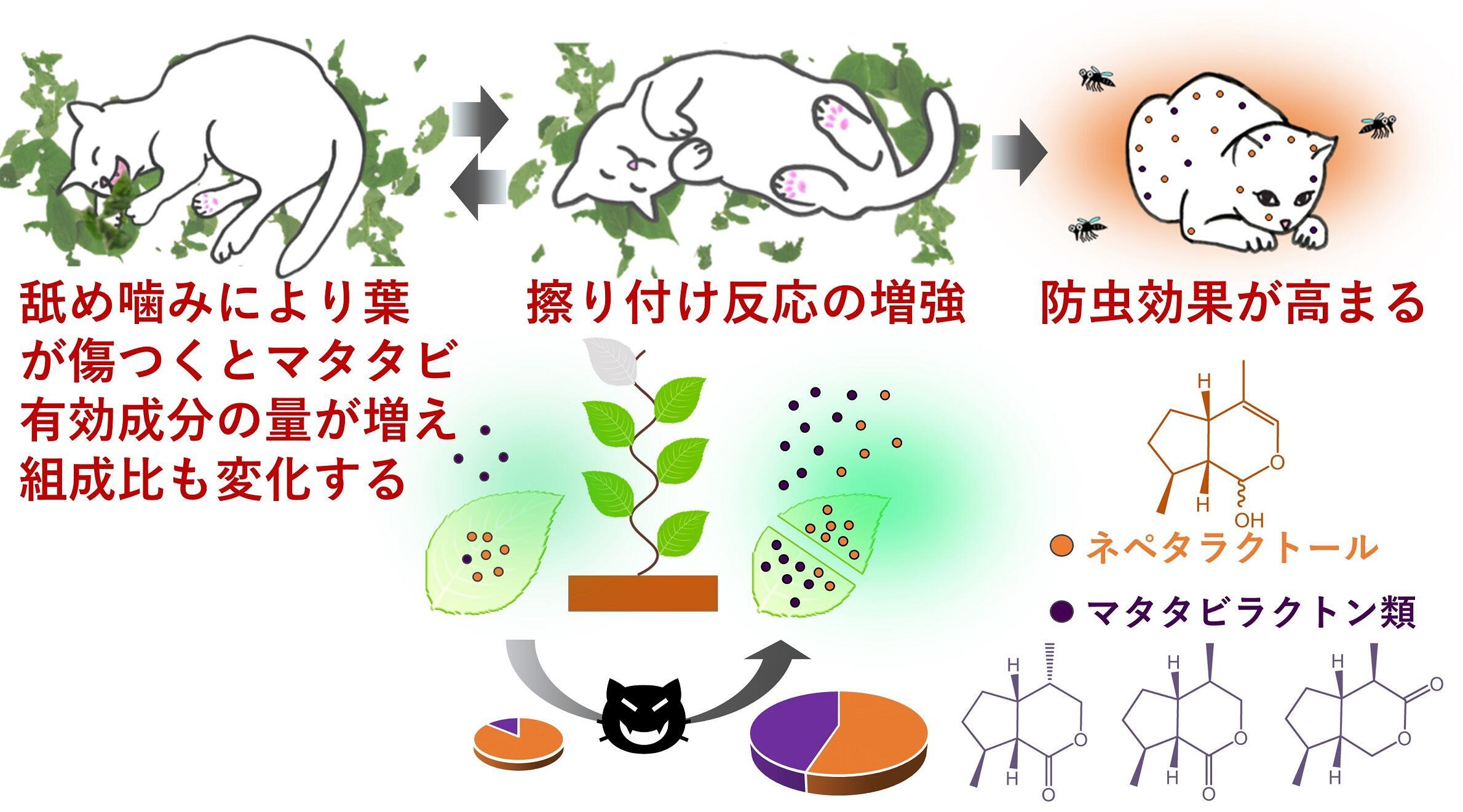猫が、マタタビの葉を噛むことでネペタラクトールとマタタビラクトン類の放出量が増加して、猫は蚊の忌避成分を最も効果的に利用できるように巧みに進化してきたと示し考えられたそうです。